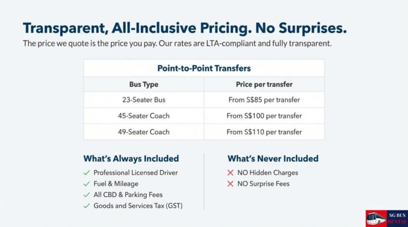 Starting from just $85 for point-to-point transfers, our bus rental Singapore, bus charter Singapore, and bus hire Singapore pricing includes driver, fuel, CBD charges, and parking fees. No surprises, no hidden costs. Our private bus charter rates are transparent and all-inclusive.