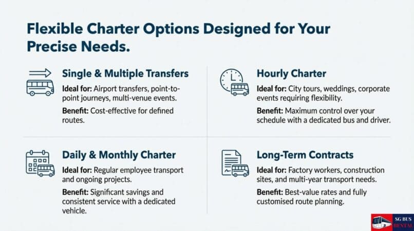 Whether you need a one-time airport transfer or long-term staff transportation, we offer flexible bus charter Singapore options to match your specific requirements. Choose the booking type that best fits your needs: