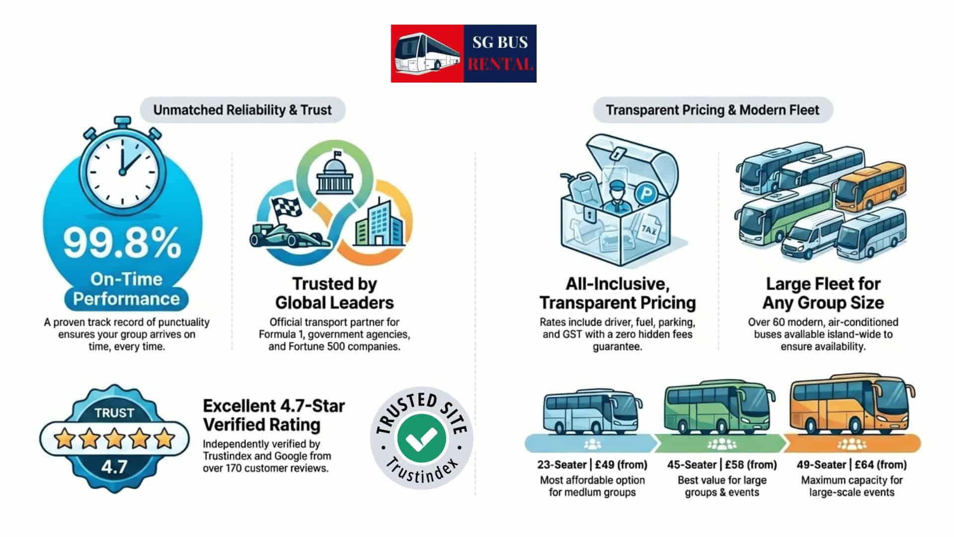 At SGBUS.sg, we believe in providing clear, upfront bus rental pricing with no hidden fees. What you see is what you pay. Our private bus hire rates are designed to be competitive and transparent, ensuring you can budget for your transportation needs with confidence. We are proud to be a Trustindex Verified company with a 4.7-star Google rating, a testament to our honest and transparent pricing.