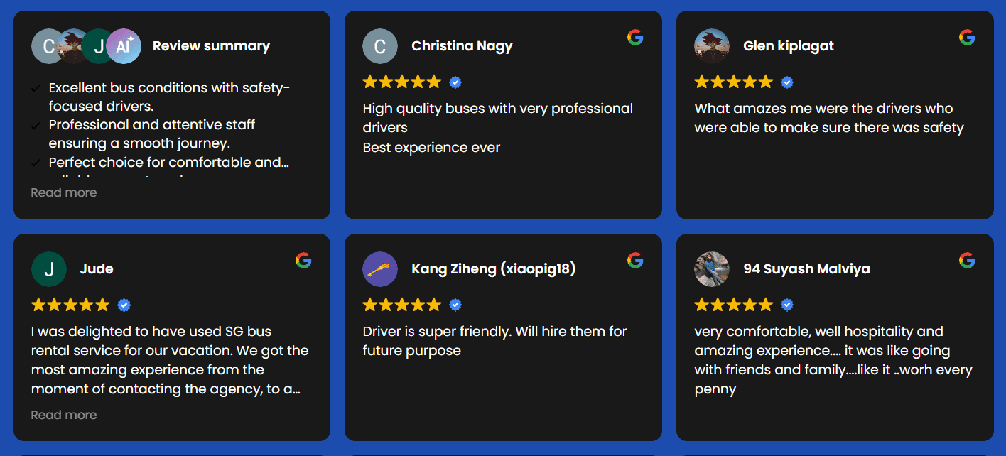 Our private bus rental Singapore, bus charter Singapore, and bus hire Singapore services have earned us a 4.7-star Google rating from over 100 verified customers. Whether you need a private bus charter for corporate events or airport transfers, our customers consistently praise our reliability, professionalism, and value. Here’s what they say: